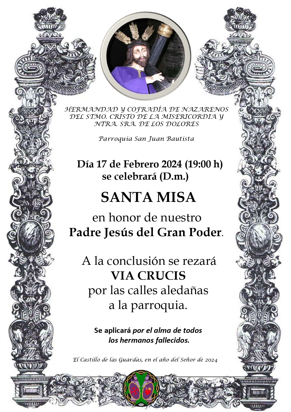 Hdad. Stmo. Cristo de la Misericordia y Ntra. Sra. de los Dolores, realizará el sábado 17, solemne Vía+Crucis con la imagen del Gran Poder por las calles centrales de la localidad tras la misa de 19:00 h.