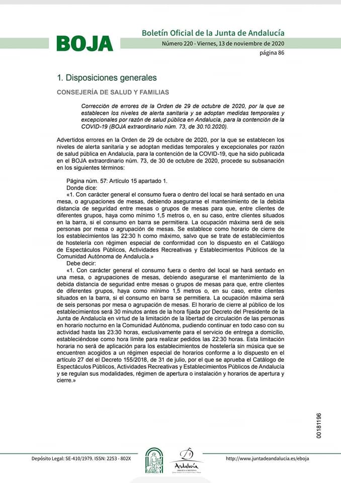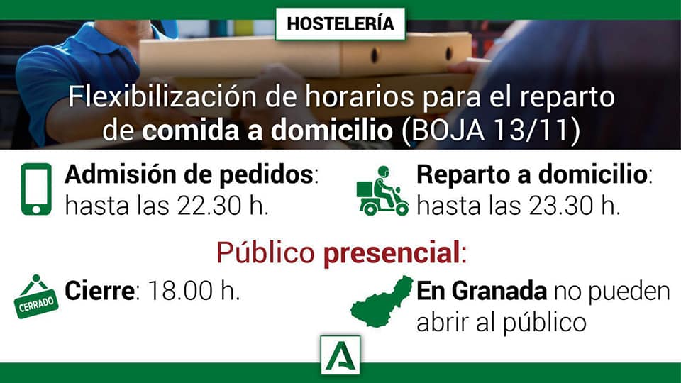 La Junta de Andalucía en su BOJA núm 220 de hoy viernes 13 de noviembre de 2020, ha introducido una nueva modificación. En estos momentos se modifica la limitación horaria que exige el cierre de los establecimientos de hostelería y restauración a las 18.00 horas. Es decir, el local debe de estar cerrado a las 18 h. de cara al público, pero se puede seguir trabajando en él si en su actividad se contempla el reparto a domicilio (que NO la recogida de comida para llevar por el cliente). Por lo que se le permite que continúe desarrollando su actividad hasta las 23:30 h.(entrega de reparto a domicilio) , siendo la última hora para recogida de pedidos hasta las 22.30 h.
