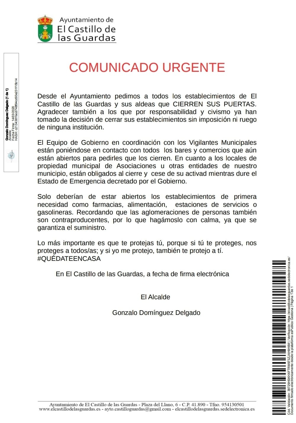Desde el Ayuntamiento pedimos a todos los establecimientos de El Castillo de las Guardas y sus aldeas que aún no lo han hecho que CIERREN LOS ESTABLECIMIENTOS, a excepción de los comercios de alimentación, farmacias, gasolineras y estaciones de servicio.