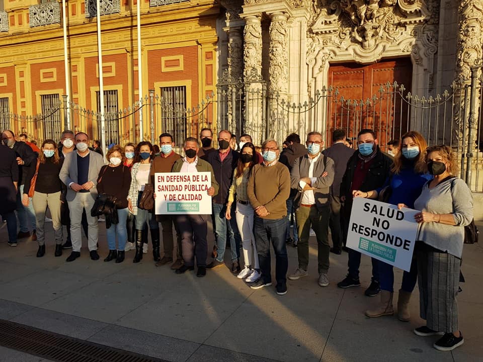 En la tarde de ayer 8 de febrero se llevó a cabo una concentración de , organizada por la Plataforma de alcaldes y alcaldesas en defensa de la sanidad pública a las puertas del Palacio de San Telmo de Sevilla.