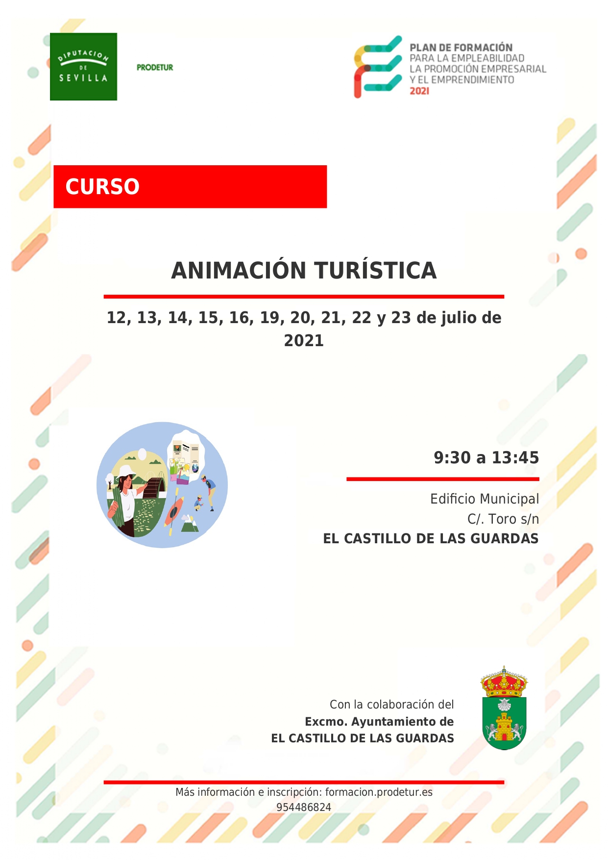 Se comunica a todos/as los/as interesados/as que la Diputación de Sevilla, a través del “Plan de Formación para la empleabilidad, la promoción social y el emprendimiento 2021” Prodetur - Diputación de Sevilla (PRODETUR, S.A.U.), en el cual colabora este Ayuntamiento, va a poner en marcha en este municipio el Curso denominado: “ANIMACIÓN TURÍSTICA”.