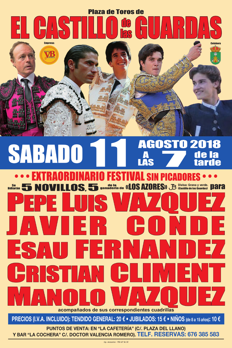 Se lidiarán 5 novillos de la Ganadería Los Azores para: PEPE LUIS VÁZQUEZ, JAVIER CONDE, ESAÚ FERNÁNDEZ, CRISTIAN CLIMENT y MANOLO VÁZQUEZ.