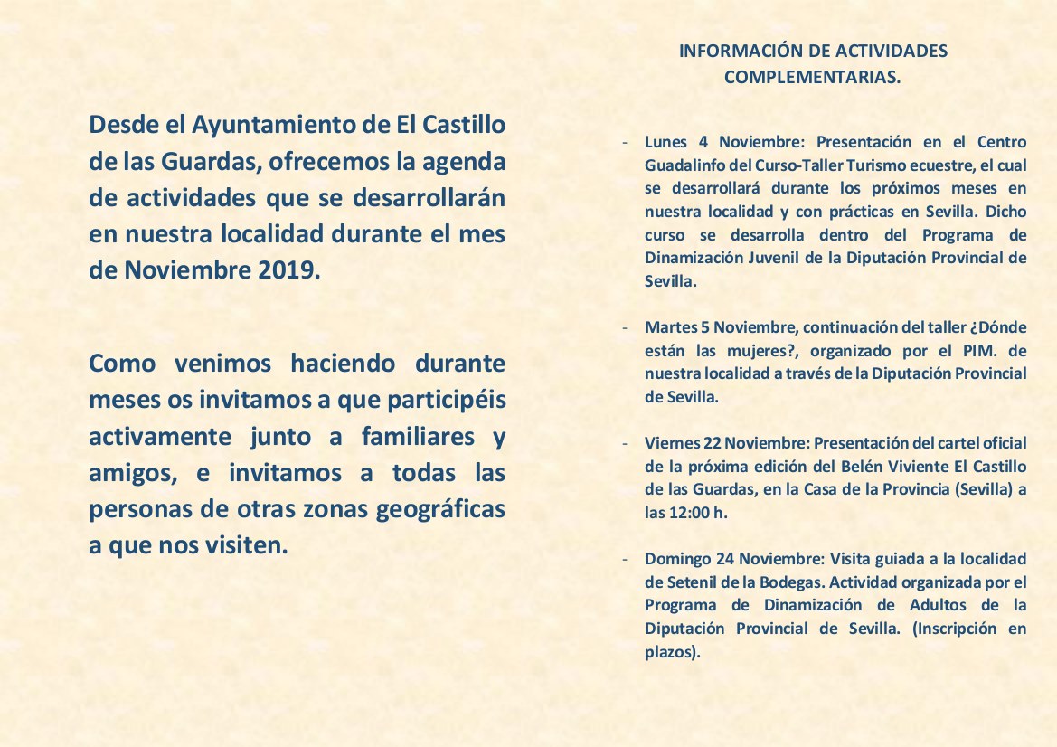 En esta galería de imágenes presentamos las actividades que se desarrollarán en nuestra localidad durante el mes de Noviembre.