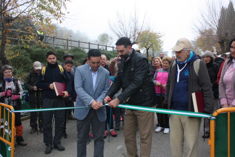 senderistas congregados en la puerta del Ayuntamiento hasta el inicio del Sendero, donde se procedió