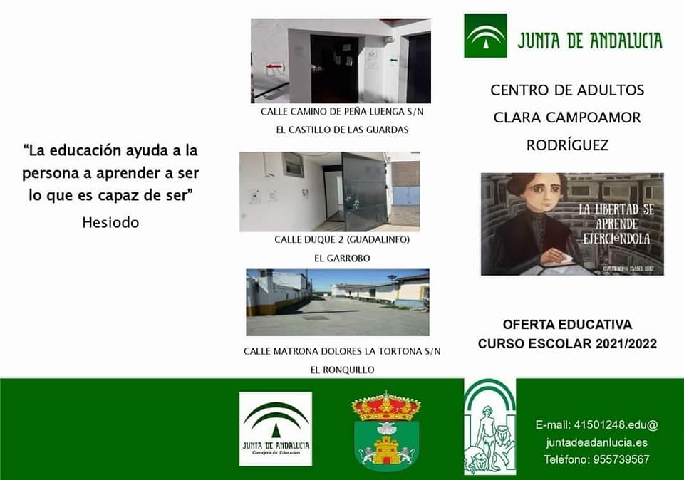 Se informa a todos/as nuestros/as vecinos/as que queda abierto el plazo de matriculación en el Centro de Adultos Clara Campoamor Rodríguez de nuestro municipio, para poder cursar en una amplia oferta educativa en el curso 2021/2022.