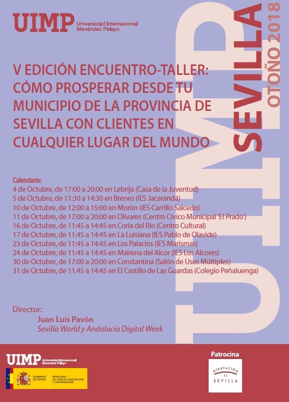 En la mañana de hoy la 2ª Tte. de Alcalde y el AIL. del Centro Guadalinfo, han acudido a la presentación oficial de los próximos talleres organizado por la UIMP de Sevilla en colaboración con la Diputación de Sevilla“Cómo prosperar con una empresa desde tu municipio de la provincia de Sevilla con clientes en cualquier lugar del mundo”, en la sede de la UIMP en Sevilla.