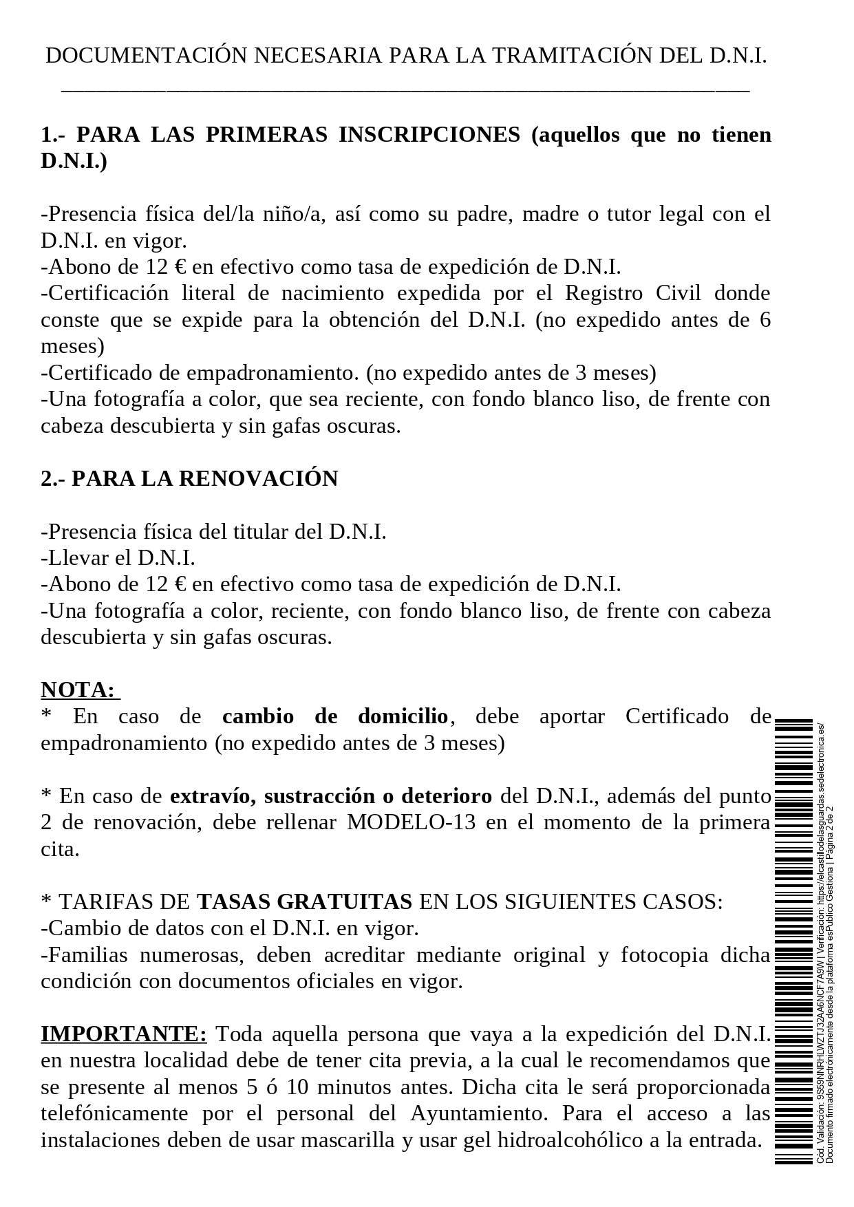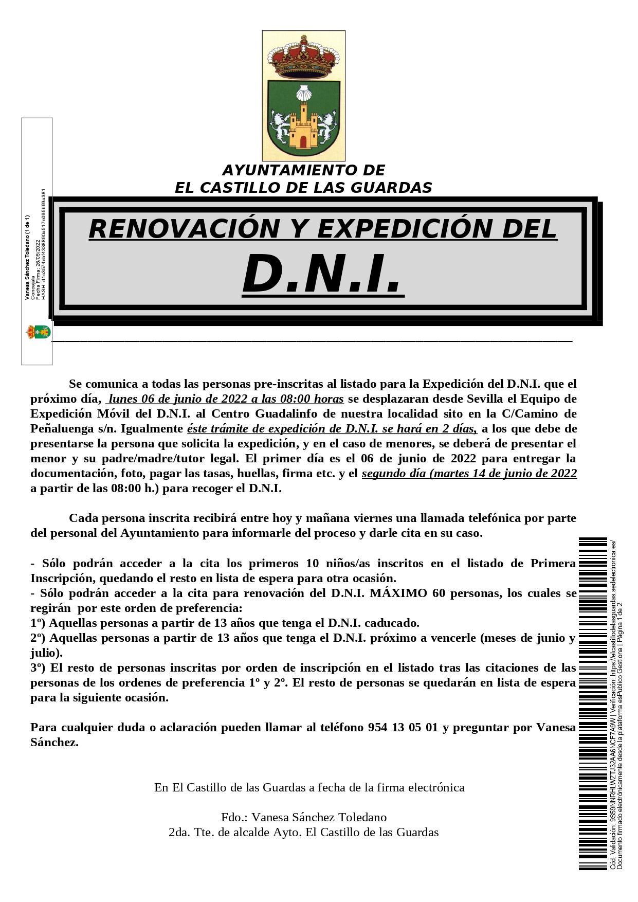Por la presente publicación se hace saber a todas las personas pre-inscritas para la renovación y expedición del DNI. en nuestra localidad, que el Equipo de Expedición Móvil del D.N.I. acudirá a nuestro pueblo el próximo LUNES 6 DE JUNIO 2022 para la renovación y expedición y el MARTES 14 DE JUNIO 2022 para su recogida, ambos días dará comienzo a las 08:00 h.